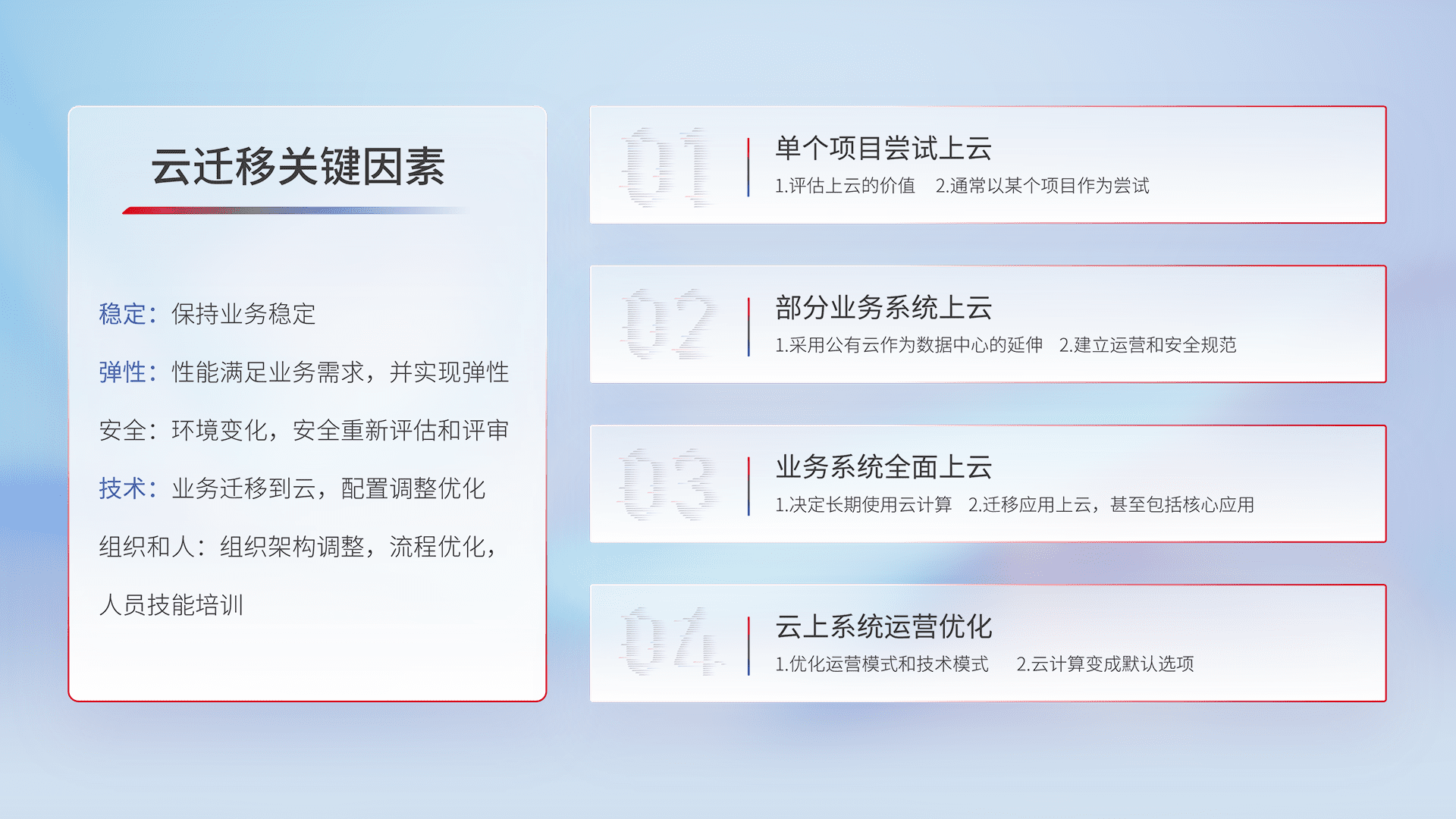 结合实际业务,,,从规划设计、、云平台选型、、、、云原生改造、、数据迁移、、、集成交付,,,迁移全过程为客户识别最佳上云路径,,,做好风险识别管理,,,,设计网络架构、、、身份权限、、安全审计合规、、、操作审计、、、、日志审计、、、监控告警策略、、、、多站点容灾设计等,,,对云上基础设施进行整体规划,,,,提升IT治理水平,,,以满足弹性、、、高可用、、、高性能的需求。。