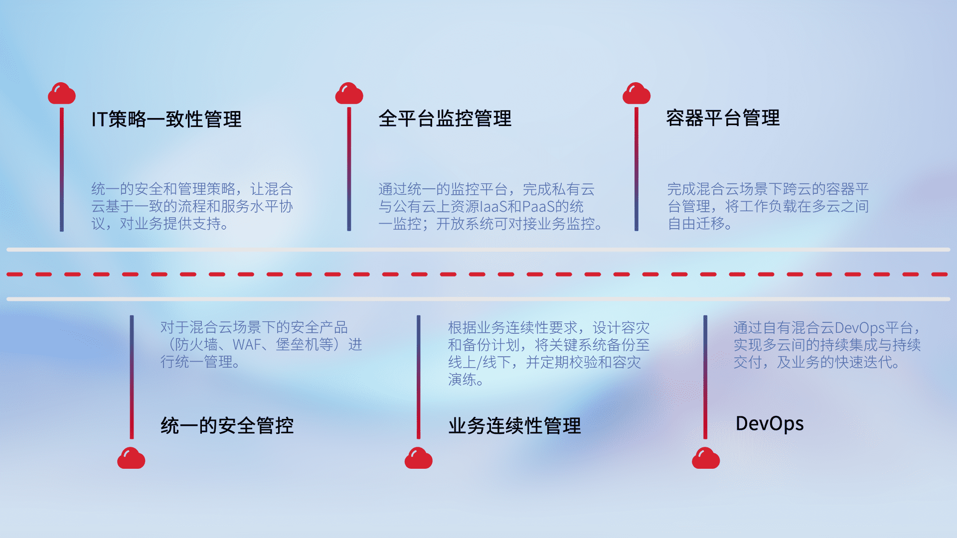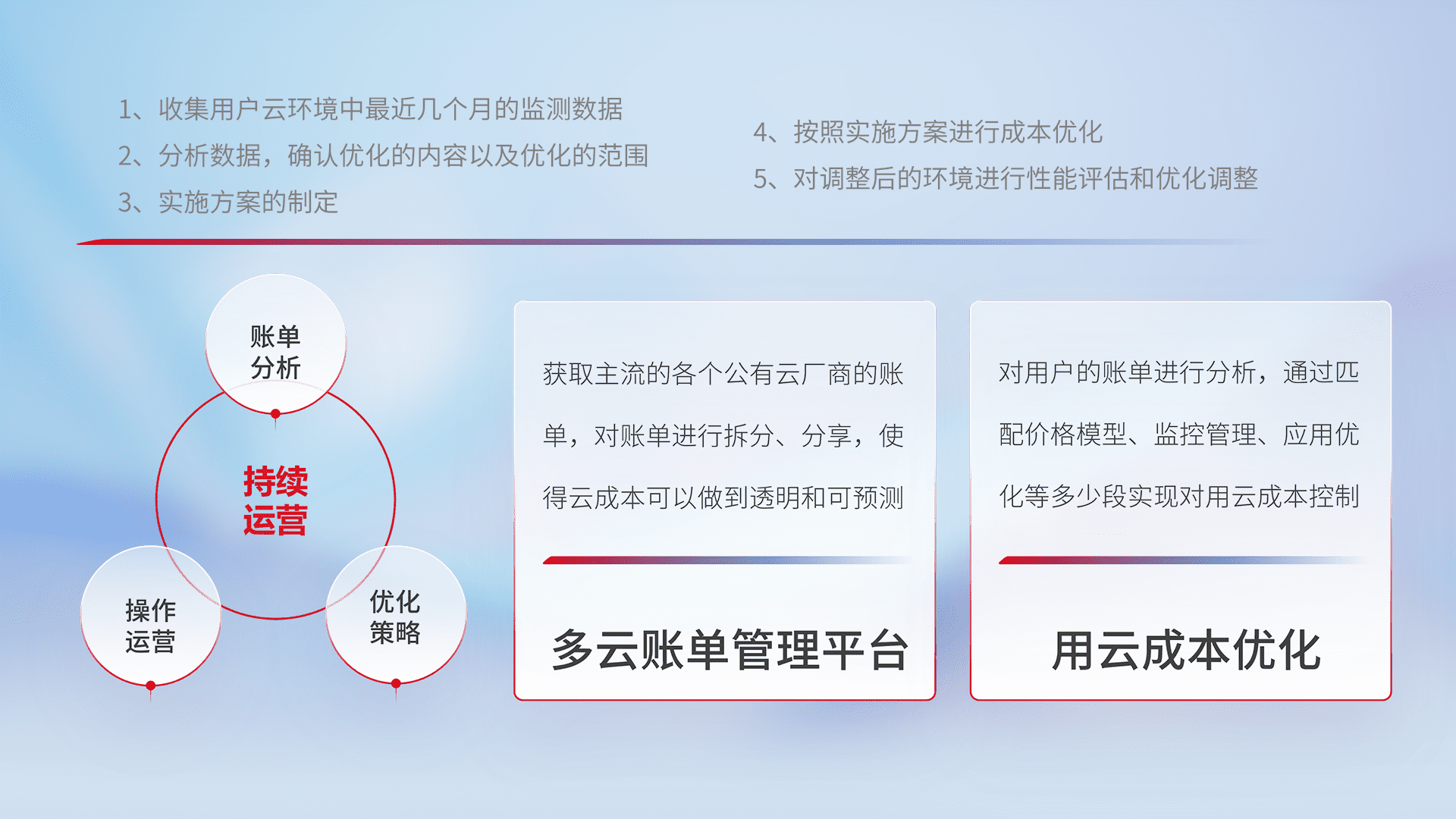 通过多云纳管,,,,以统一的资源数据模型把客户的云资源进行抽象和封装,,,进而实现对多云资源的统一操作,,保障云资源管理的可靠性、、、、稳定性与可用性。。量身定制化运维内容,,配置、、、开发运维、、、补丁管理、、、、备份、、、、监控、、、认证和访问管理、、、审计和日常巡检等,,保障在用云过程中的可靠度,,,稳定度以及高可用率。。