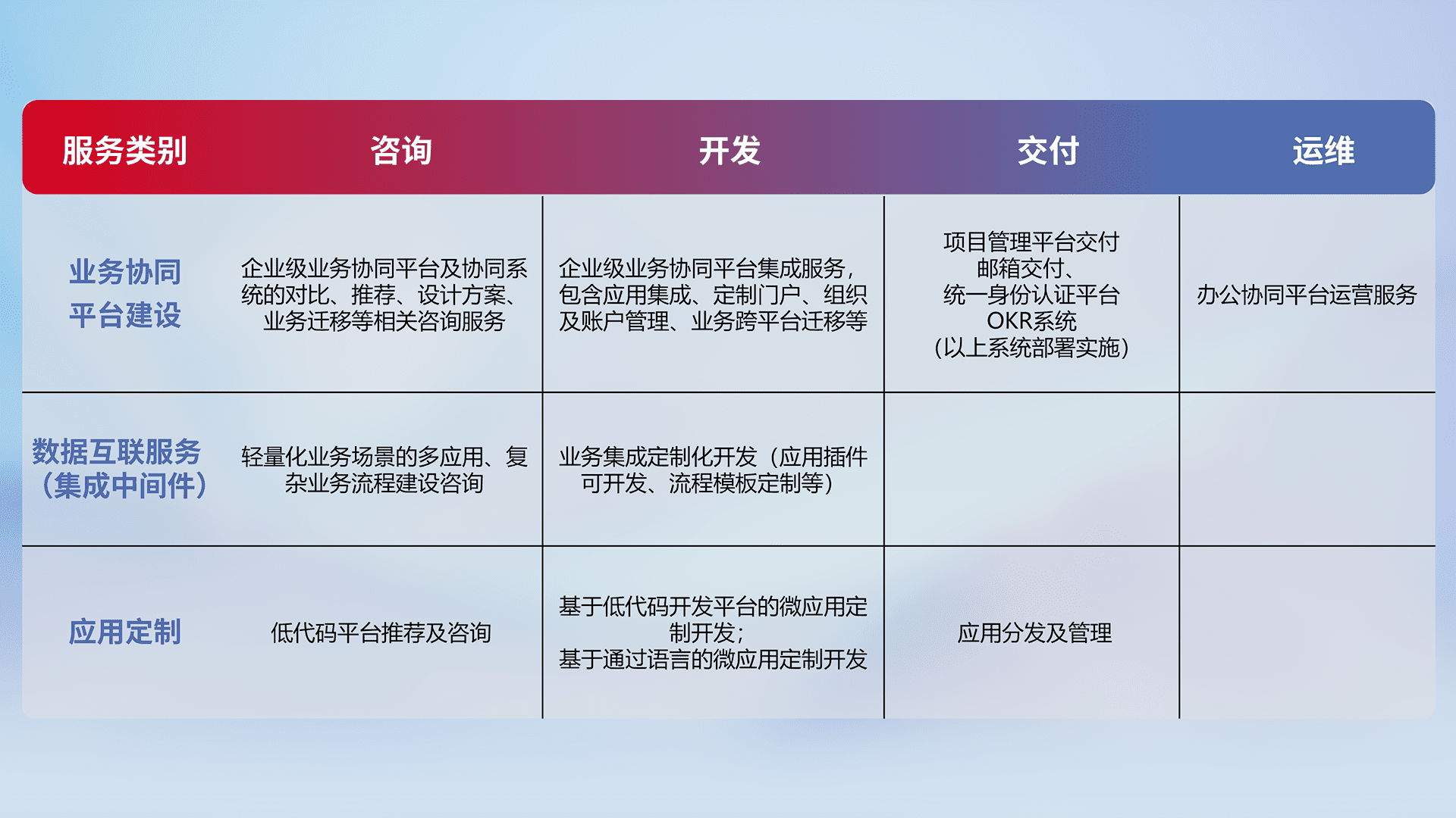 针对钉钉、、企微、、IDaas等平台级产品提供产品的规划、、、方案、、、、交付、、、定制化开发等服务,,实现如统一协同办公、、智能客户服务、、混合会议管理、、、、智能数据查询、、等业务场景,,实现数字化转型。。